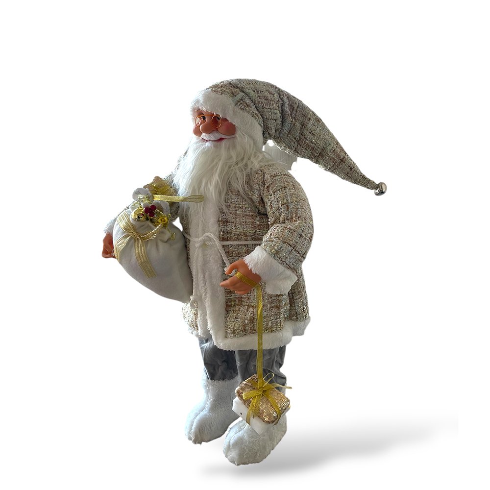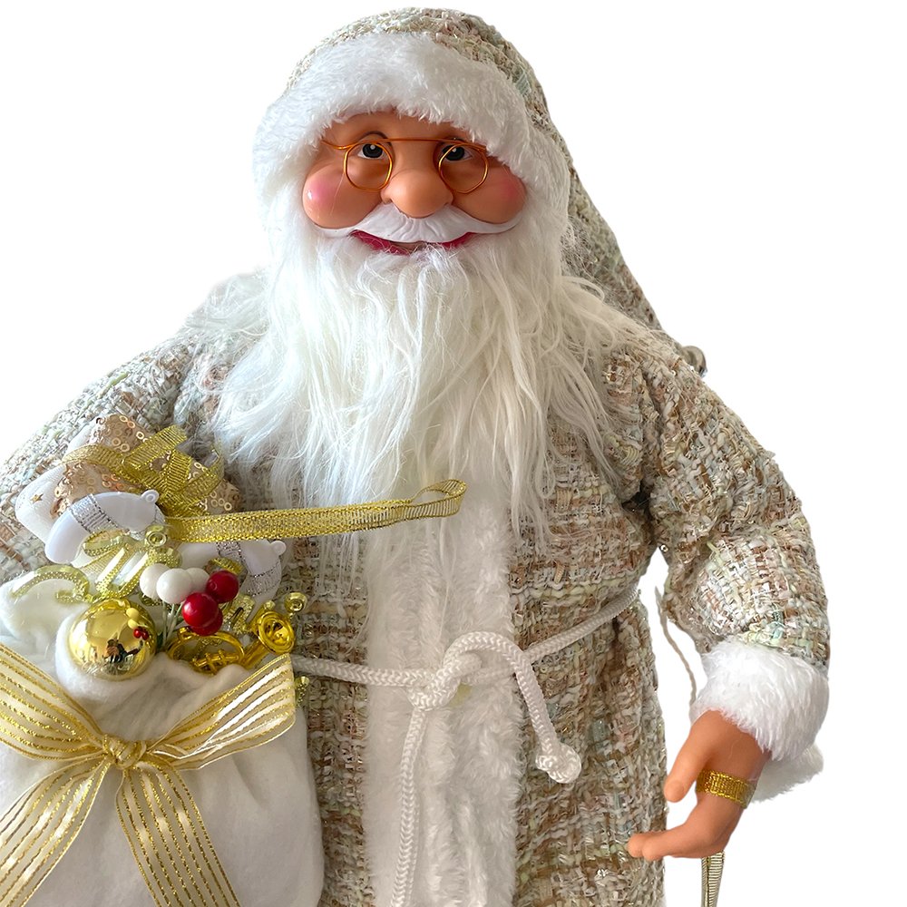 Ο Άγιος Βασίλης φοράει ένα υφασμάτινο παλτό με υφή μπουκλέ και γούνα, κρατάει στο ένα χέρι διακοσμητικό δώρο με χρυσή κορδέλα και στο άλλο ένα λευκό σακουλάκι γεμάτο γιορτινά στολίδια. Η χαριτωμένη έκφραση και η fluffy γενειάδα του προσθέτουν μια γλυκιά, ζεστή πινελιά στο χριστουγεννιάτικο σκηνικό σας.