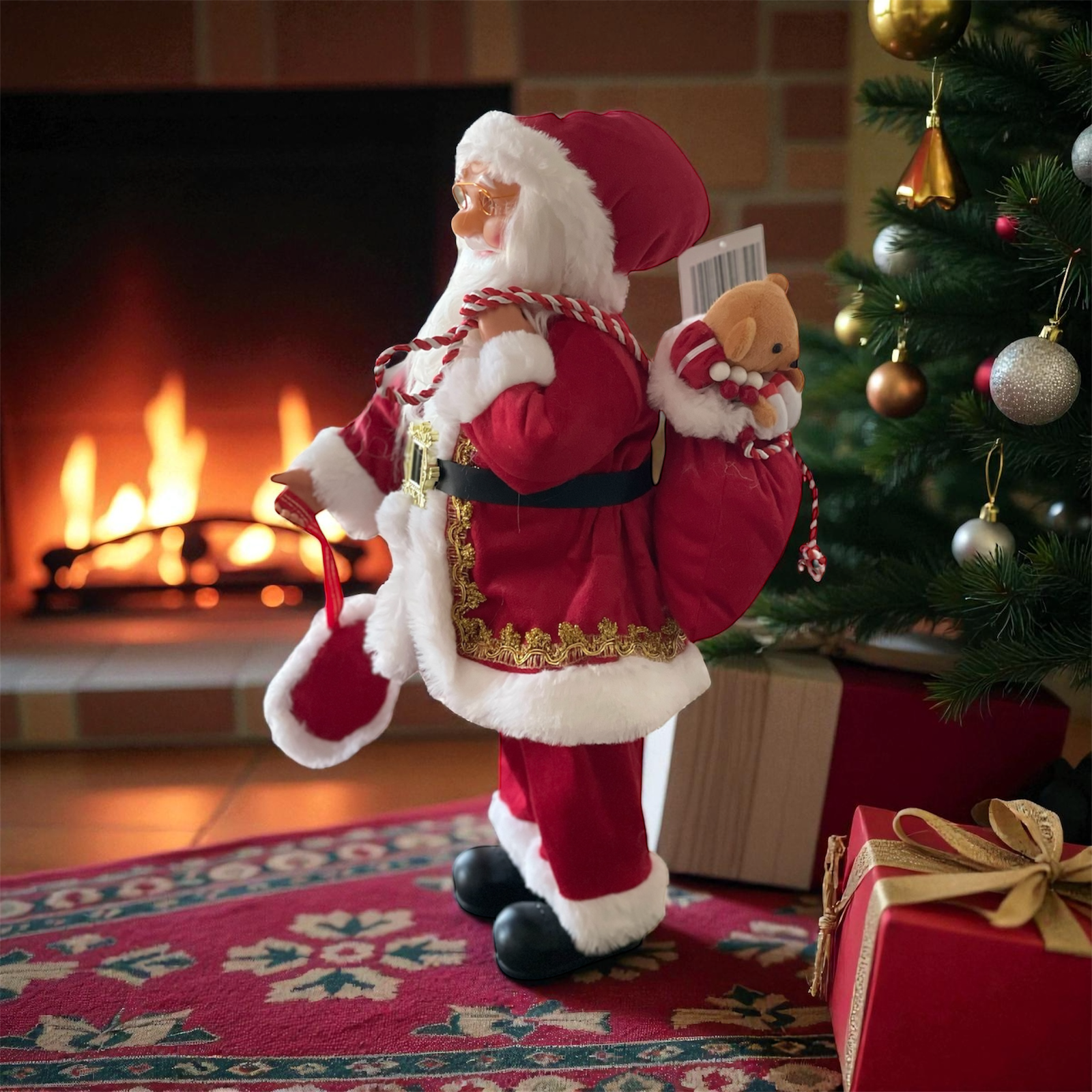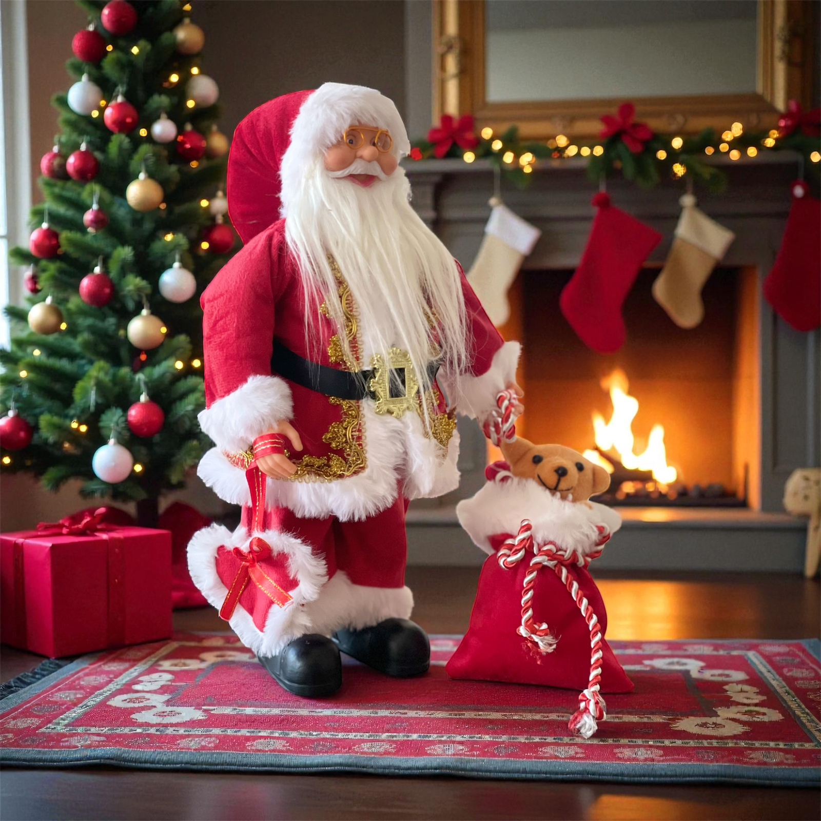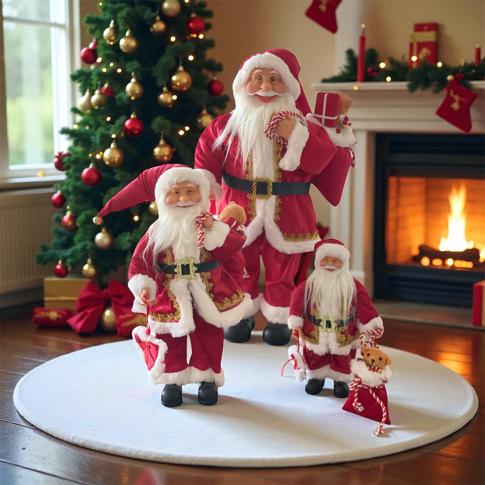 Στη φωτογραφία βλέπετε πώς το Σετ 3 Άγιων Βασίληδων «δένει» άψογα μπροστά στο τζάκι, στο χριστουγεννιάτικο δέντρο ή πάνω σε ένα χαλί ― προσθέτοντας αμέσως μια αίσθηση θαλπωρής και πραγματικής γιορτινής μαγείας.